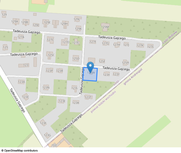- nieruchomości położonej przy ul. Tadeusza Gajcego 123 W, 92-610 Łódź, dla której Sąd Rejonowy dla Łodzi-Śródmieścia w Łodzi XVI Wydział Ksiąg Wieczystych (adres: ul. ul.Pomorska 21, Łódź, 90-202 Łódź) prowadzi księgę wieczystą o numerze Ld1m/xxxxxxxx/1.