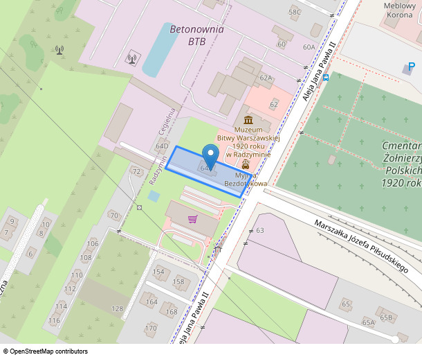 - nieruchomości położonej przy Aleja Jana Pawła II 64A, 05-250 Radzymin, dla której SĄD REJONOWY W WOŁOMINIE IV WYDZIAŁ KSIĄG WIECZYSTYCH (adres: ul. Prądzyńskiego Ignacego 3A, WOŁOMIN, 05-200 WOŁOMIN) prowadzi księgę wieczystą o numerze WA1W/xxxxxxxx/3.