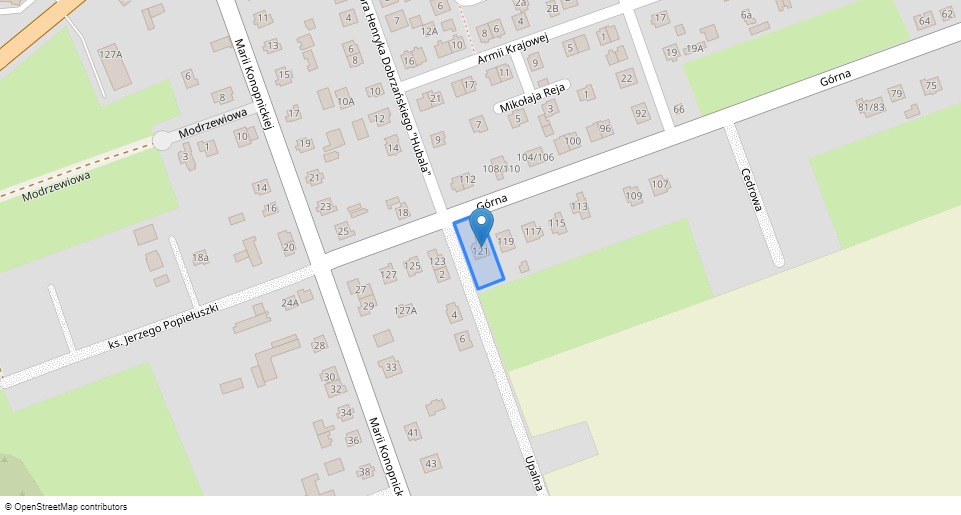 - nieruchomości, której właścicielem jest ******** położonej przy Górna 121, 16-100 Sokółka, dla której Sąd Rejonowy w Sokółce IV Wydział Ksiąg Wieczystych (adres: ul. Piłsudskiego 7, Sokółka, 16-100 Sokółka) prowadzi księgę wieczystą o numerze BI1S/xxxxxxxx/7.