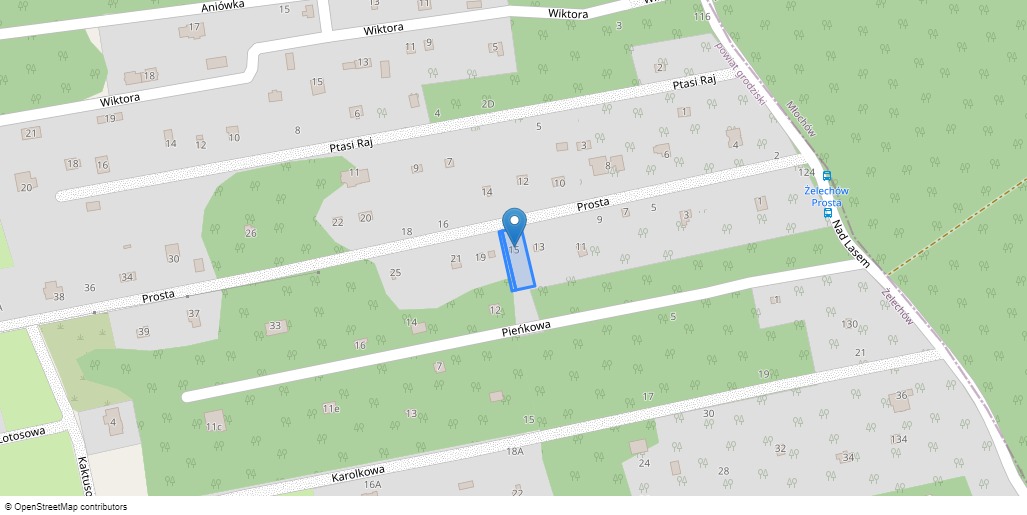 należącej do ****** zabudowanej nieruchomości, dla której Sąd Rejonowy w Żyrardowie V Wydział Ksiąg Wieczystych prowadzi księgę wieczystą o numerze PL1Z/xxxxxxxx/3. Nieruchomość jest położona przy ul. Prostej 15 w miejscowości Żelechów, w gminie Żabia Wola, w powiecie grodziskim. Zgodnie z miejscowym planem zagospodarowania przestrzennego nieruchomość leży na terenie zabudowy rekreacyjnej z dopuszczeniem zabudowy mieszkaniowej jednorodzinnej wolnostojącej. Nieruchomość stanowi działki ewidencyjne nr 451/2 i 452 o łącznej powierzchni 753 metrów kwadratowych. Na nieruchomości znajduje się zdewastowany drewniany budynek letniskowy oraz skladzik gospodarczy o konstrukcji metalowej.