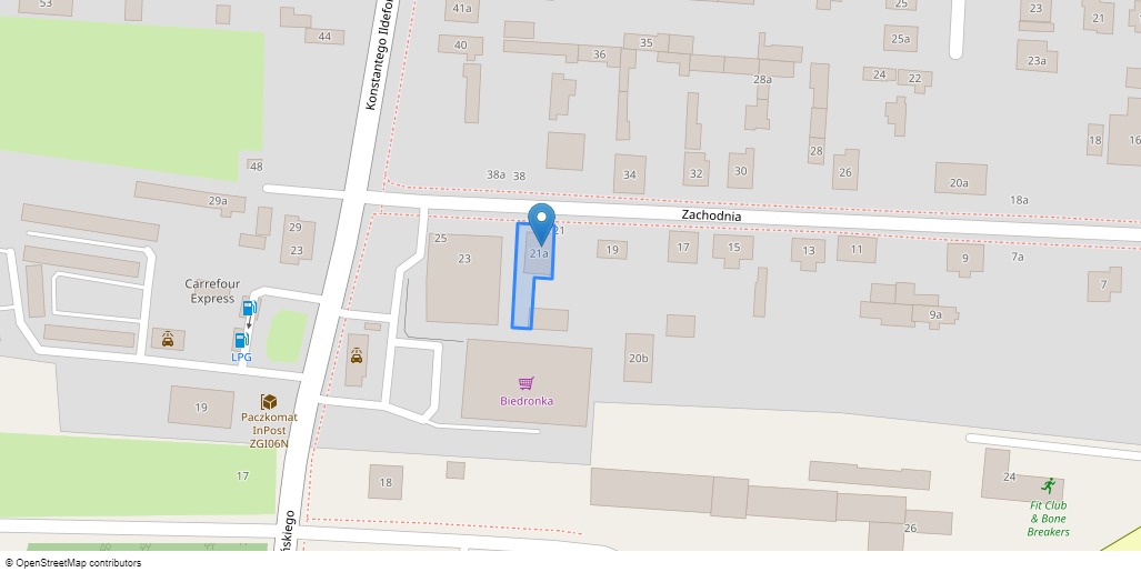 - nieruchomości położonej przy Zachodnia 21A/., 95-100 Zgierz, dla której Sąd Rejonowy w Zgierzu (adres: ul. Sokołowska 6/., Zgierz, 95-100 Zgierz) prowadzi księgę wieczystą o numerze KW LD1G/xxxxxxxx/7 .