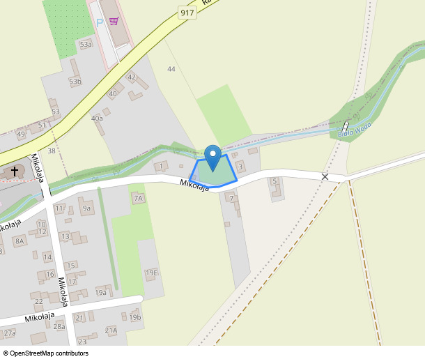 Działka posiada powierzchnię 1279 m2 i kształt zbliżony do trapezu, jest częściowo ogrodzona (ogrodzenie z siatki stalowej, na słupkach stalowych). Teren działki jest płaski, porośnięty trawą, krzewami oraz kilkoma drzewami. Wzdłuż północnej granicy płynie strumyk (ciek wodny). Działka nie jest wyposażona w urządzenia infrastruktury technicznej, ale sieć wodociągowa, energetyczna oraz kanalizacyjna przebiegają w drodze, obok działki. Nieruchomość posiada bezpośredni dostęp do drogi publicznej o nawierzchni asfaltowej – ulicy Mikołaja.