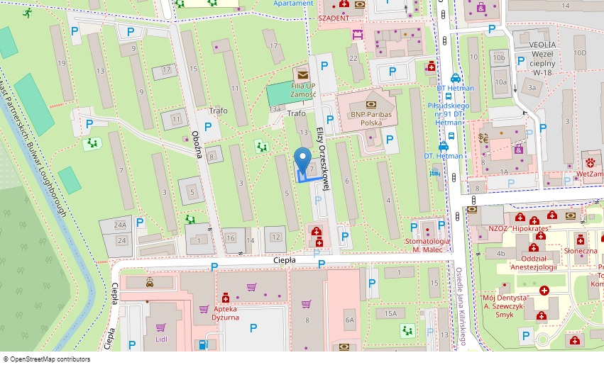 - nieruchomości, której właścicielem jest ********* położonej przy ul. E. Orzeszkowej , 22-400 Zamość, dla której Sąd Rejonowy w Zamościu VI Wydział Ksiąg Wieczystych (adres: ul. ul. Prymasa Stefana Wyszyńskiego /22-400, Zamość, 22-400 Zamość) prowadzi księgę wieczystą o numerze ZA1Z/xxxxxxxx/8.