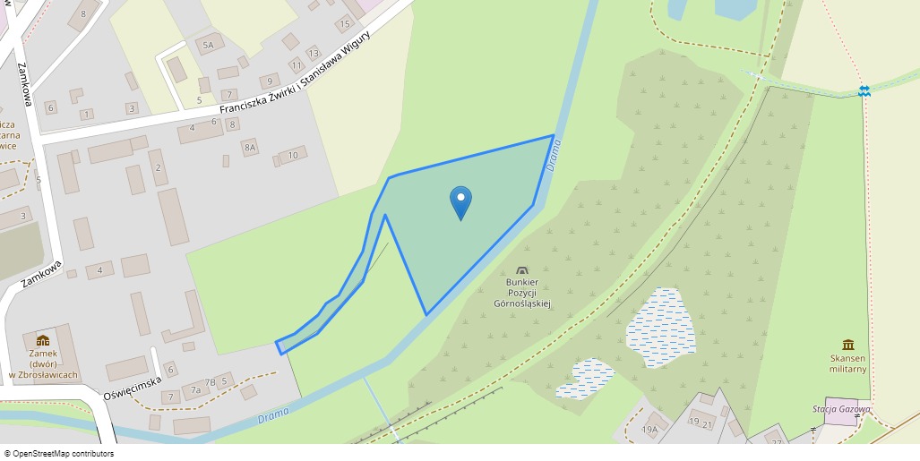 niezabudowana działka gruntu nr 645/143 o powierzchni 13.349 m2, przeznaczona na cele usług turystycznych i sportu, nieużytkowana, nieuzbrojona, położona nad rzeką Dramą, porośnięta trawą i nielicznymi drzewami