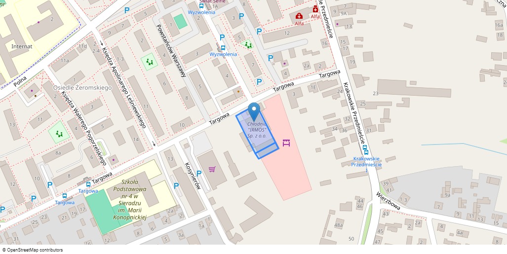 Przedmiotem licytacji jest nieruchomość gruntowa, w skład której wchodzą działki 68/3, 69/1 i razem tworzą niepodzielną całość gospodarczą. Działka nr 69/1 jest pierwszą działką od ul. Targowej i posiada bezpośredni dostęp do drogi publicznej. Działka nr 68/3 położona jest równolegle do działki 69/1 i dojazd do niej jest możliwy tylko przez działkę 69/1. Działki tworzą niepodzielną całość, ponieważ na obu z nich posadowiony jest budynek przemysłowy. Działki są o kształcie regularnego prostokąta, szerokie od drogi około 35m, długie około 74 m, teren płaski, są uzbrojone w przyłącze wody sieciowej, energetyczne, kanalizacji sieciowej. Powierzchnie niezabudowane nieruchomości są utwardzone masą asfaltową. Nieruchomość jest ogrodzona od frontu drogi płotem z murowanych filarów i posiada dwie bramy wjazdowe ze stali. Nieruchomość graniczy z działkami zabudowanymi. Budynki sąsiednie są posadowione w granicy opisanych działek 69/1, 68/3. Działki posiadają łączną powierzchnię 2573 m2, użytki Bi – inne tereny zabudowane. Poszczególne powierzchnie dla działek przedstawiają się następująco: Nr ewidencyjny 68/3 powierzchnia 0,0340 ha; Nr ewidencyjny 69/1 powierzchnia 0,2233 ha. Nieruchomość zabudowana jest sześcioma budynkami przemysłowymi.